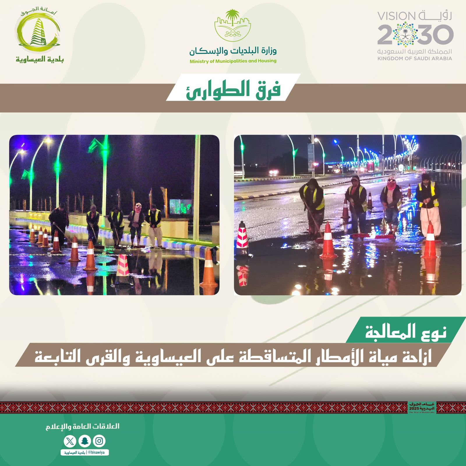 وأضاف أن فرقة من فنيي الكهرباء وفنيي ميكانيك المضخات تتابع عمل المضخات أثناء هطول الأمطار، مشيرًا إلى أنه في الأماكن غير المخدومة بشبكة تصريف ومع هطول الأمطار باشرت بلدية مركز العيساوية بكامل إمكاناتها بالعمل على سحب التجمعات من الشوارع تباعاً باستخدام وايتات شفط المياه أو المضخات بحيث لا تسبب الأمطار أي إعاقة لحركة المرور في المدينة.