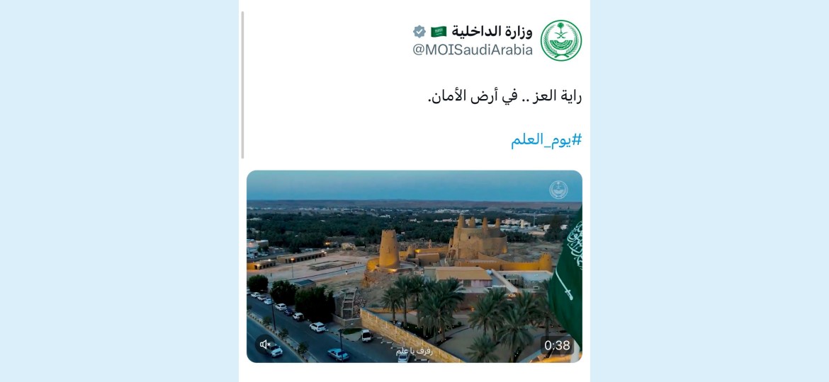 تفاعلت وزارة الداخلية عبر منصاتها بمواقع التواصل الاجتماعي وقطاعاتها مع يوم العلم والذي يصادف الحادي عشر من مارس من كل عام ، تجسيدًا لما توليه القيادة الرشيدة - حفظها الله - من اهتمام برمزية العلم ودلالاته الوطنية المهمة.