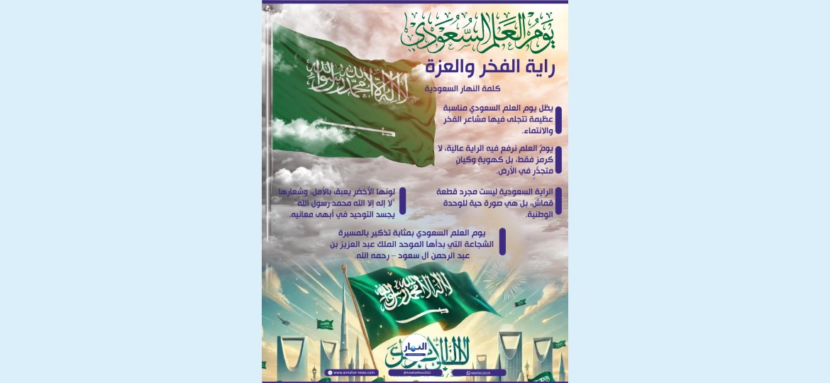 يوم العلم السعودي لا يقتصر على رفع الراية في السماء فقط، بل هو تذكير لنا جميعًا بتلك المسيرة الشجاعة التي بدأها الموحد الملك عبد العزيز بن عبد الرحمن آل سعود – رحمه الله – حين وحد هذا الوطن الكبير تحت راية الإسلام.