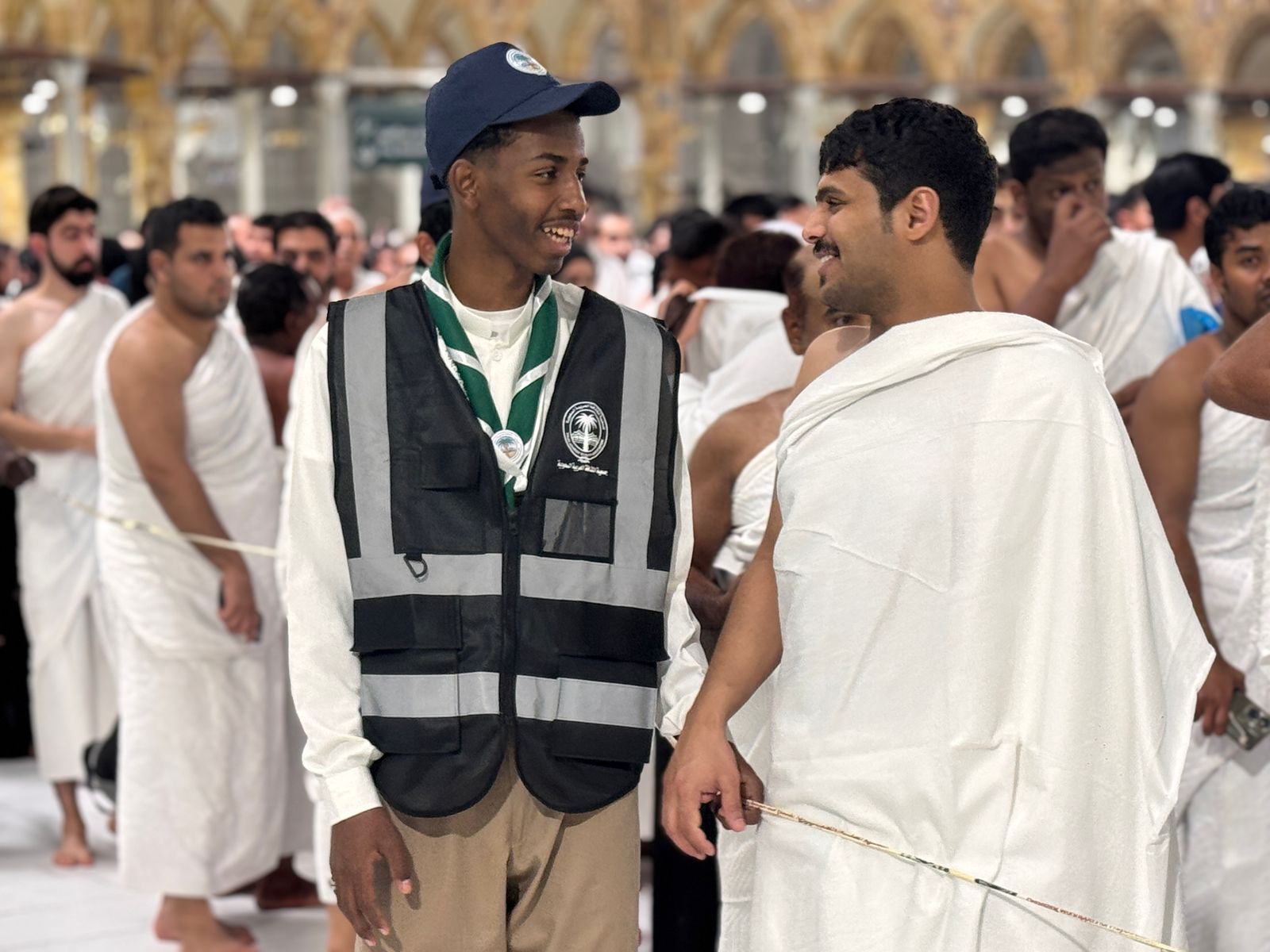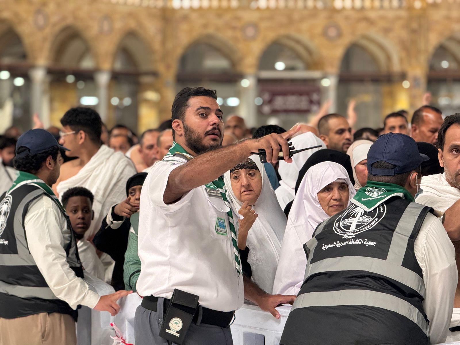 ويعمل الفتية والشباب في مجالات متعددة تشمل إرشاد التائهين، وتقديم المساعدة لكبار السن وذوي الاحتياجات الخاصة، إضافة إلى دعم الجهات الأمنية والصحية والخدمية، وهو ما يعكس روح المبادرة وحب العطاء الذي يتحلى به هؤلاء الشباب والفتيات، ومن الطبيعي خلال ذلك العمل التطوعي الإنساني وقوع الكثير من المواقف والقصص ومنها القصة المؤثرة التي تعكس مدى التفاني في خدمة ضيوف الرحمن، حيث يروي الكشاف "شكري وترة" موقفاً مميزاً حين لمح طفلًا يخرج من مصلى النساء متجهاً نحو الكعبة المشرفة، فأدرك أن الطفل ربما قد تاه عن ذويه، ودون تردد، سارع شكري إلى الطفل وحمله بحنان إلى المصلى، حيث لم تمضِ سوى دقائق حتى جاءت والدته، وهي سيدة باكستانية، تبحث عنه بقلق بالغ، وما إن رأته حتى احتضنته بشدة، بينما كانت تلهج بالدعاء للكشاف على إنقاذه لطفلها من الضياع وسط زحام الحرم، أما فتاة الكشافة "ود سامي السنوسي"، فتروي موقفاً آخر من العطاء، حيث لاحظت معتمرين مسنين - رجل وامرأتان - وقد أنهكهم التعب وسط الزحام، فاقتربت منهم بلطف وعرضت المساعدة، فأشار الرجل، الذي كان يستند إلى عكازه، إلى حاجته إلى كرسي للجلوس ومكان للصلاة فلم تتردد ود في اصطحابهم إلى توسعة الملك فهد، حيث وفرت له كرسياً ليتمكن من أداء عبادته براحة، لينطلقوا بعدها بالدعاء لها بعبارات طيبة أسعدت قلبها وأكدت لها قيمة عملها التطوعي، كما شاركت فتاة الكشافة "ريتاج علي شعيري" قصة أخرى تعكس عظمة الشعور بخدمة ضيوف الرحمن، حيث ساعدت امرأة مسنة من ذوي الاحتياجات الخاصة كانت تجد صعوبة في تحريك عربتها بسبب الزحام، فبذلت فتاة ريتاج جهدها في دفع العربة حتى وصلت بالسيدة إلى مصلى النساء وساعدتها في إيجاد مكان مناسب للصلاة، معتبرةً أن هذا الموقف البسيط منحها إحساساً عظيماً بالرضا، وأكد لها شرف خدمة المعتمرين والصوام والمصلين.