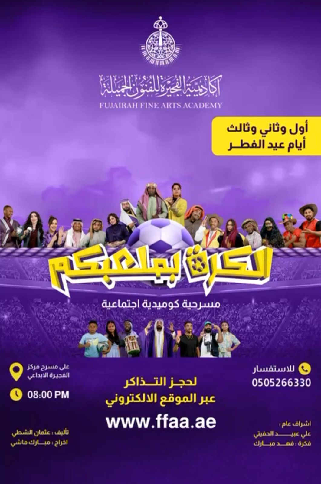 اعلن سعادة علي عبيد الحفيتي مدير عام اكادمية الفجيرة للفنون الجميلة بانطلاق عروض المسرحية الاجتماعية الكرة بملعبكم خلال ايام عيد الفطر المبارك في الثلاث الايام الاولى على مسرح الفجيرة الابداعي بمشاركة كبيرة من نجوم الخليج والامارات حيث تلعب دور البطولة الفنانة هيا الشعيبي والفنانة الاماراتية مشاعل الشحي والنجم ابراهيم القحومي والفنان موسى البقيشي ومجموعة كبيرة من فناني الامارات والفجيرة .