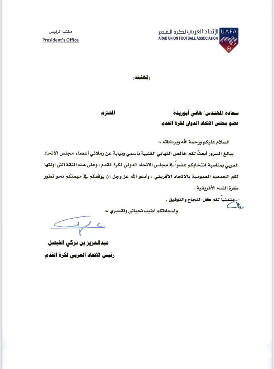 تلقى المهندس  هاني أبو ريدة  رئيس اتحاد الكرة المصري، خطاب تهنئة من سمو الأمير عبد العزيز بن تركي الفيصل، وزير الرياضة السعودي، ورئيس الاتحاد العربي لكرة القدم، بعد حصوله على ثقة الجمعية العمومية للاتحاد الأفريقي لكرة القدم، كاف، وفوزه بمقعد مجلس الاتحاد الدولي، فيفا.