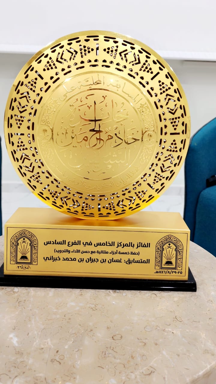 أقامت الجمعية الخيرية لتحفيظ القرآن الكريم بمحافظة الجبيل مساء امس حفل تكريم الطالب غسان جبران خبراني- الفائز بالمركز الخامس بالفرع السادس على جائزة خادم الحرمين الشريفين الملك سلمان بن عبدالعزيز آل سعود لحفظ القرآن الكريم وتجويده وترتيله وتفسيره في دورتها ٢٦ على مستوى المملكة .