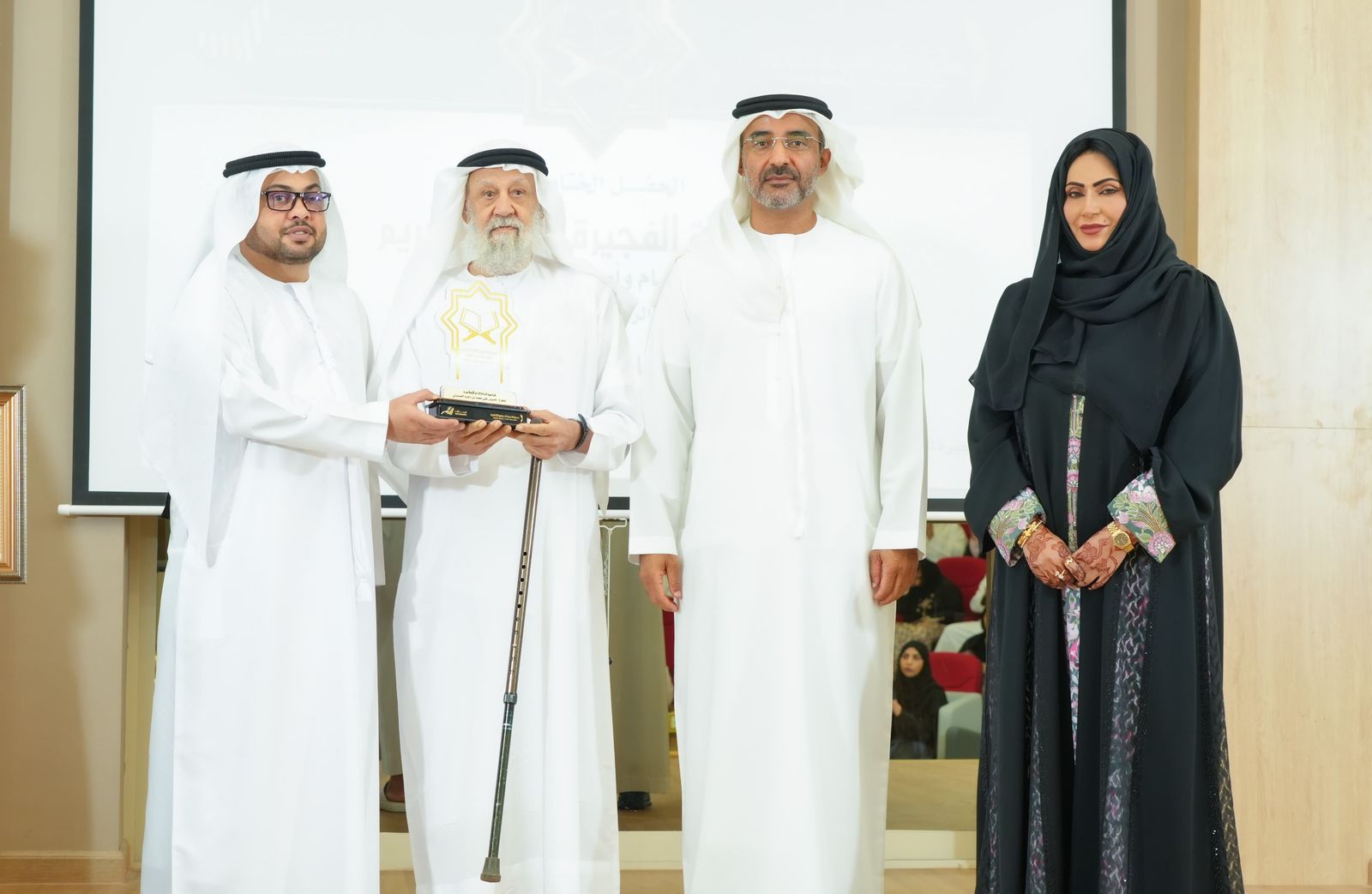 وقام الشيخ سعيد بن سرور الشرقي والدكتور خالد الظنحاني والدكتورة هدى الدهماني في ختام الحفل بتكريم الفائزين في المسابقة والرعاة والداعمين فضلًا عن تكريم لجنة تحكيم المسابقة.