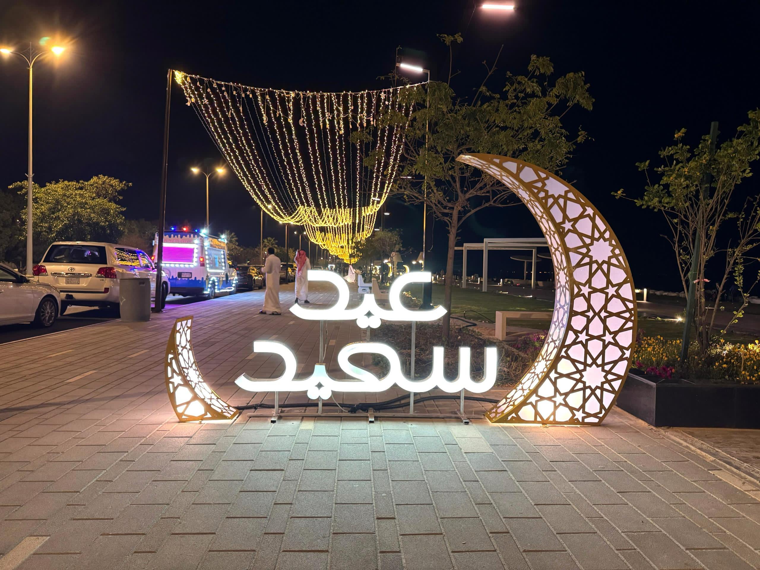 كما تم تزيين عدد من المباني ببنرات تحمل تصاميم العيد، إلى جانب استخدام أجهزة إضاءة الفيديو ثلاثي الأبعاد (3D Mapping) وأجهزة سيتي كولو والقوبو، التي تسهم في تقديم عروض ضوئية مميزة، فيما خُصص العرض ثلاثي الأبعاد بالبروجكتر على مبانٍ رئيسية، لإضافة لمسات بصرية إبداعية تواكب الاحتفال بهذه المناسبة.
