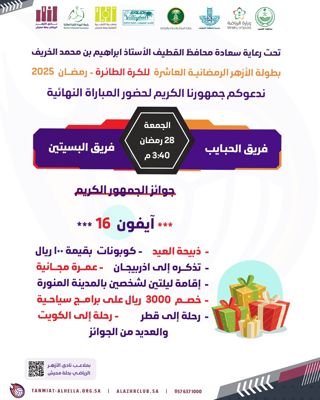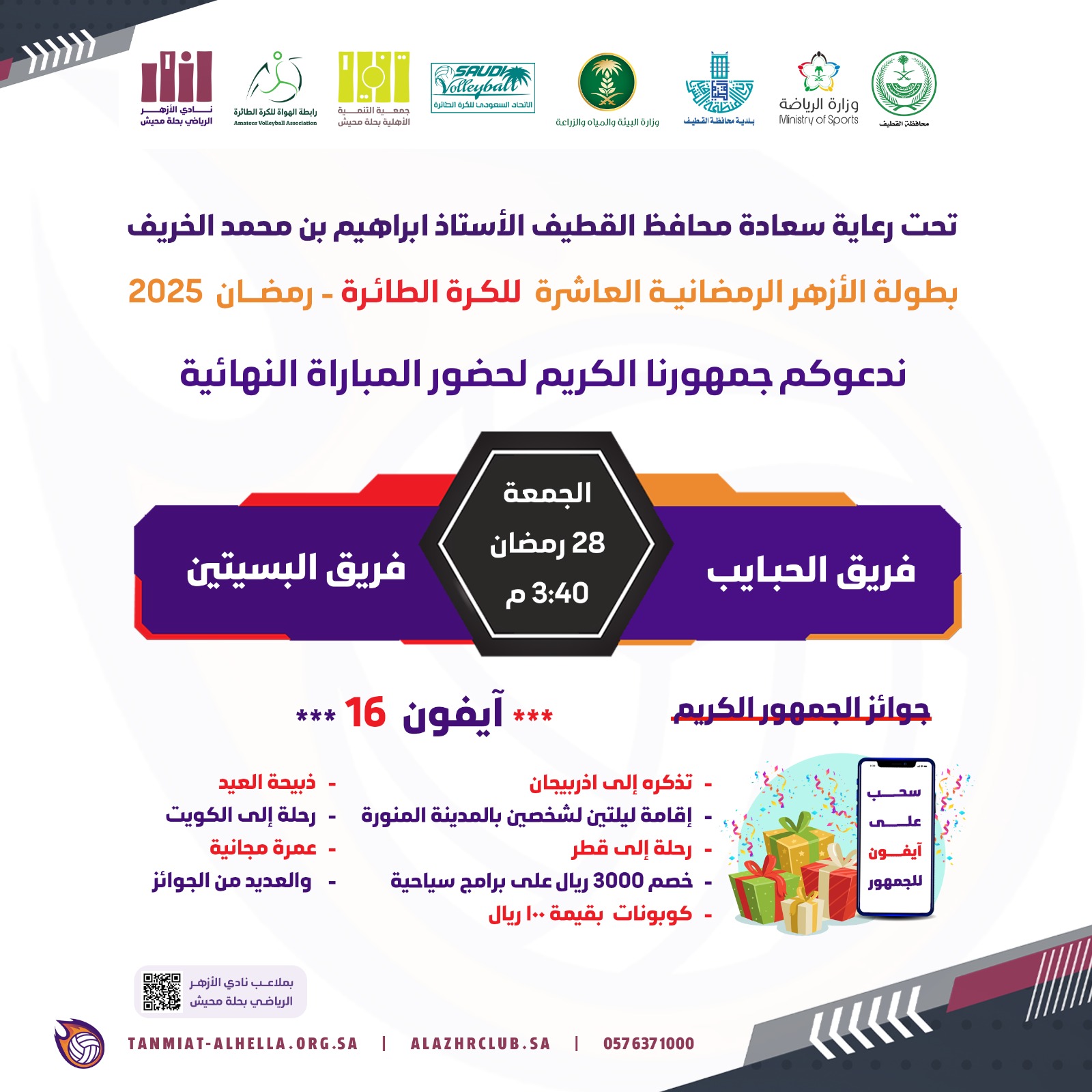 تحت رعاية سعادة محافظ القطيف الأستاذ إبراهيم بن محمد الخريف تختتم اليوم الجمعة بطولة الأزهر الرمضانية العاشرة لكرة الطائرة والتي ينظمها نادي الأزهر الرياضي وجمعية التنمية الاجتماعية بحلة محيش .