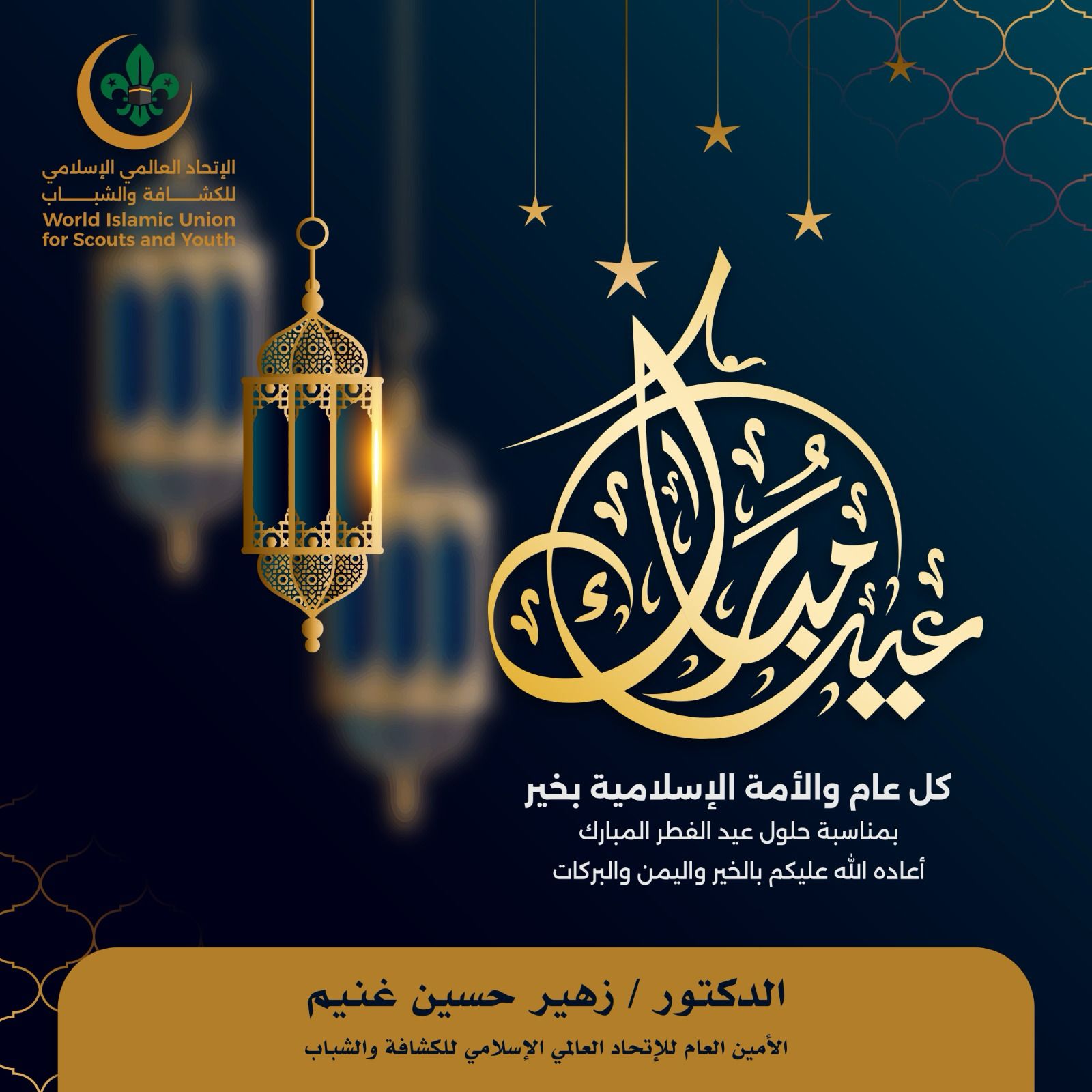 رفع الأمين العام للإتحاد العالمي الإسلامي للكشافة والشباب الدكتور زهير بن حسين غنيم أجمل التهاني والتبريكات لمقام خادم الحرمين الشريفين الملك سلمان بن عبدالعزيز آل سعود وسمو ولي عهده الأمين رئيس مجلس الوزراء صاحب السمو الملكي الأمير محمد بن سلمان بن عبدالعزيز - حفظهما الله - وللشعب السعودي بمناسية عيد الفطر المبارك 1446هـ،