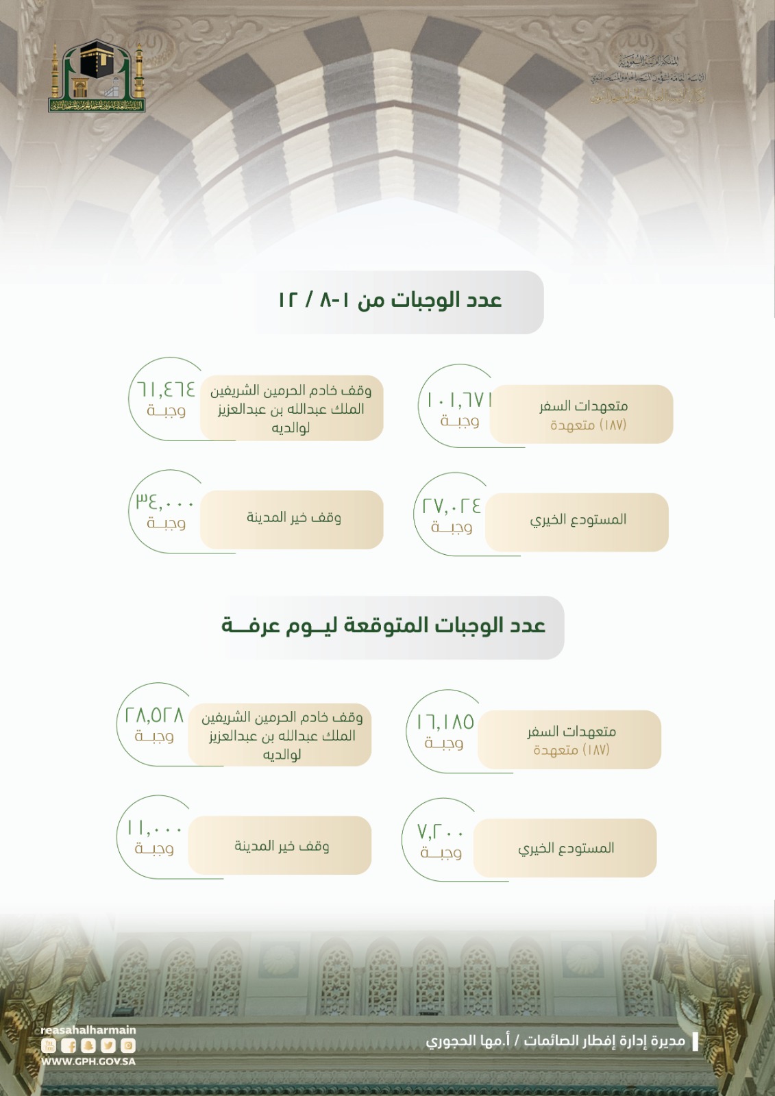 بلغة الأرقام التي توثق الحدث والمنجز الذي تحقق منذ بداية الأيام العشر المباركة وفي موعد يتجدد في رحاب المسجد النبوي مع إفطار الصائمات عمدت وكالة الرئاسة العامة لشؤون المسجد النبوي ممثلة في الأقسام النسائية  لادارة فرق العمل واستقطاب عدة قطاعات مجتمعية للمشاركة في تقديم وجبات الافطار للصائمات حيث شارك وقف خادم الحرمين الشريفين الملك عبدالله رحمه الله لوالديه بتوفير ( 61,464) وجبة ، ووقف خير المدينة وفروا (34.000) وجبة والمستودع الخيري ( 27.024) وجبة خلال الفترة من ١- ٨ من ذو الحجة . وليبلغ عدد الوجبات المتوقعة ليوم عرفة ( 16.185) وجبة من متعهدات السفر (187) متعهدة ، ومن وقف خير المدينة (11.000) وجبة ومن وقف خادم الحرمين الشريفين الملك عبدالله رحمه الله لوالديه ( 28.528) وجبة والمستودع الخيري ( 7200) وجبة.