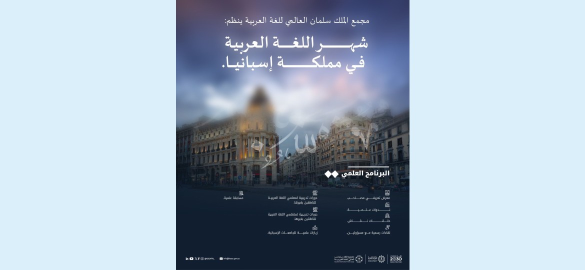 يُطلق  مجمع الملك سلمان العالمي للغة العربية  برنامج (شهر اللغة العربية) في مملكة إسبانيا، في المدة من 01 إلى ٣٠ أبريل ٢٠٢٥م، ضمن مشروع برامج علمية حول تعليم اللغة العربية الذي ينفذه المجمع في عدد من الدول حول العالم؛ بهدف دعم تعليم اللغة العربية دوليًّا، وتعزيز التعاون الأكاديمي والتعليمي بين المملكة العربية السعودية والمؤسسات التعليمية والجامعات العالمية.