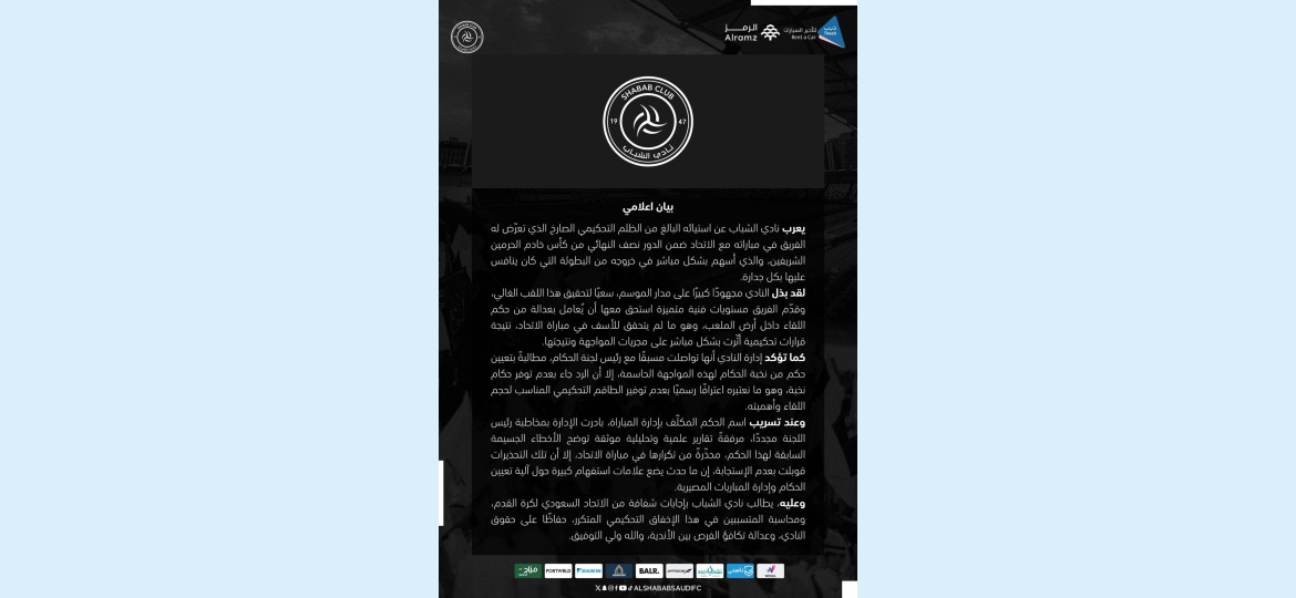 أوضح نادي الشباب غضبه مما وصفه "الظلم التحكيمي الصارخ" الذي تعرض له أمام الاتحاد في مباراة قبل نهائي كأس ملك السعودية لكرة القدم.