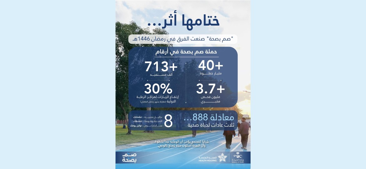 اختتمت شركة الصحة القابضة، بالتعاون مع التجمعات الصحية العشرين التابعة لها، حملة "صم بصحة" لشهر رمضان المبارك 1446هـ، محققة إنجازات نوعية تمثلت في تجاوز عدد الخطوات المسجلة 40 مليار خطوة، إلى جانب إجراء أكثر من 3.7 ملايين فحص مخبري منذ بداية الشهر الفضيل.
