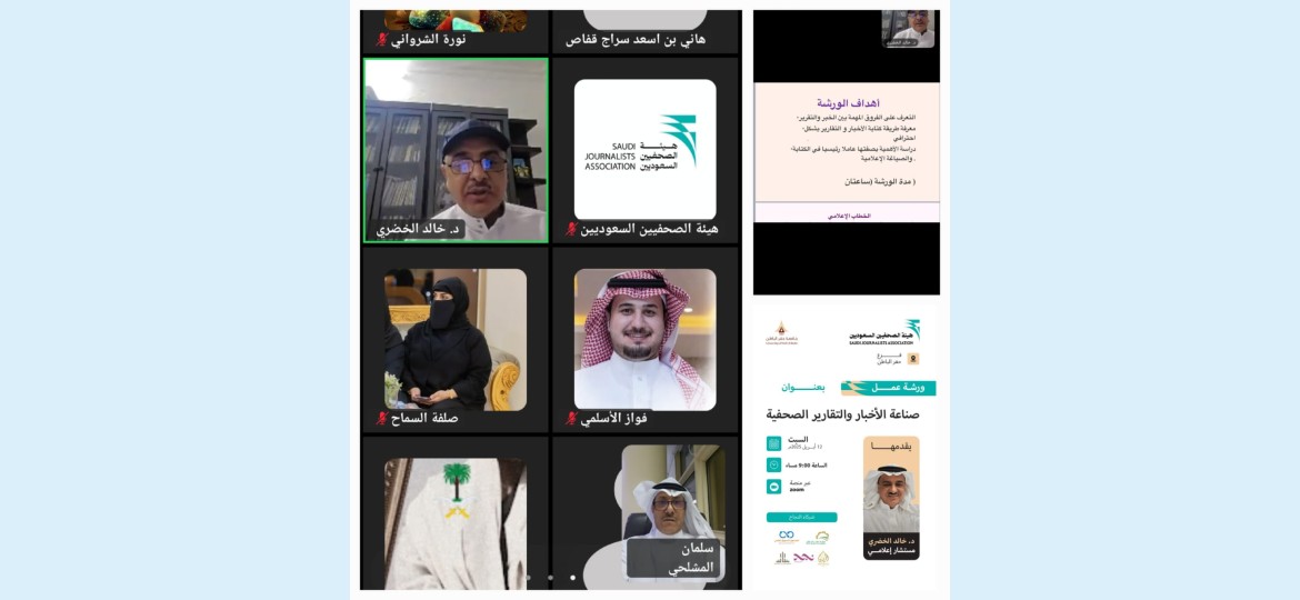 نظم فرع هيئة الصحفيين السعوديين بحفرالباطن، مساء أمس، ورشة عمل تدريبية عبر منصة Zoom بعنوان "صناعة الأخبار والتقارير الصحفية"، قدّمها المستشار الإعلامي الدكتور خالد الخضري، ضمن برنامج "الصحافة الرقمية والإعلام الجديد "، الذي ينفذ بالتعاون بين هيئة الصحفيين السعوديين وجامعة حفرالباطن.