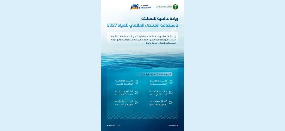 يذكر أن المنتدى العالمي للمياه، الذي يُنظمه المجلس العالمي للمياه بالمشاركة مع الدول المستضيفة، يعتبر الحدث الأكبر والأهم في مجال إدارة المياه عالميًا، ويوفر منصة لتبادل الأفكار والمعرفة والتعاون بين الأطراف المعنية حول العالم، ويتيح الفرص لطرح أفضل الممارسات الدولية، وإيجاد سبل التعاون لضمان الإدارة المستدامة لموارد المياه على مستوى العالم.