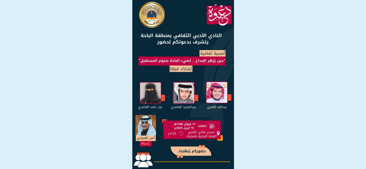 ضمن جهود نادي الباحة الأدبي الثقافي لإثراء المشهد الأدبي المحلي بدعم الطاقات الإبداعية وبواكير المواهب الشابة في مختلف المجالات  ينظم النادي مساء الثلاثاء القادم الموافق 17 شوال 1446 هـ أمسية ثقافية تحمل عنوان  "حين يزهر الإبداع تحتفي الباحة بنجوم المستقبل" بالتعاون مع الغرفة التجارية عند الساعة 8  والنصف مساء على مسرح ماشي العُمري.