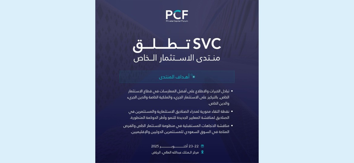 في تاريخ 9 أبريل 2025: أعلنت السعودية للاستثمار الجريء (SVC) بانها سوف تنظيم منتدى الاستثمار الخاص (Private Capital Forum 2025)، وهو المنتدى الأول من نوعه في المملكة العربية السعودية الذي يركز على منظومة الاستثمار الخاص (الاستثمار الجريء، الملكية الخاصة، الدين الجريء والدين الخاص). وذلك في مركز الملك عبدالله المالي (KAFD) بالعاصمة الرياض يومي 22 و23 أكتوبر 2025.