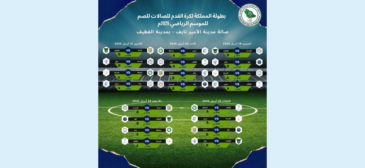 تنطلق صباح غدا السبت منافسات بطولة المملكة لكرة القدم للصالات للصم والتي ينظمها الاتحاد السعودي لرياضة الصم على صالة مدينة الأمير نايف بالقطيف خلال الفترة من 21 إلى 26 شوال الجاري الموافق من 19 إلى 24 أبريل 2025 بمشاركة 10 فرق تم توزيعها على مجموعتين ضمت المجموعة الأولى فرق "نادي الصم بجدة، مركز الصم بالطائف، مركز الصم بصامطة ، مركز الصم بنجران، مركز الصم بالمدينة المنورة".