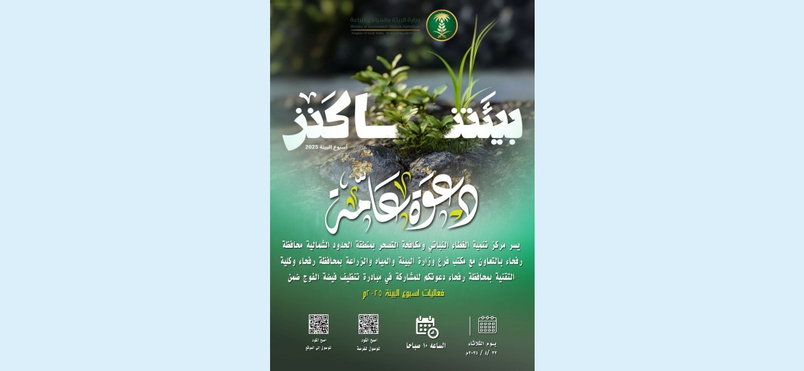 دعا مركز تنمية الغطاء النباتي ومكافحة التصحر بمنطقة الحدود الشمالية بمحافظة رفحاء، بالتعاون مع مكتب وزارة البيئة والمياه والزراعة وكلية التقنية برفحاء، أفراد المجتمع للمشاركة في مبادرة تنظيف فيضة الفوج، وذلك ضمن فعاليات أسبوع البيئة لعام 2025م.