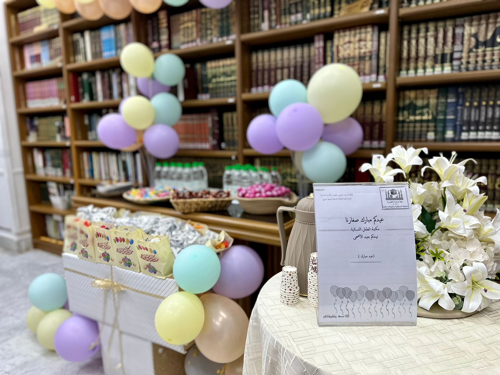 وكان البرنامج الثالث منها مخصص للأطفال نفذته الوكالة المساعدة للشؤون العلمية والأكاديمية النسائية ممثلة بإدارة المكتبة النسائية بعنوان " عيد مبارك " اشتمل على ورشة عمل تضمنت دروس توعوية وتثقيفية لأطفال زائرات المسجد النبوي بين جنبات المكتبة النسائية .