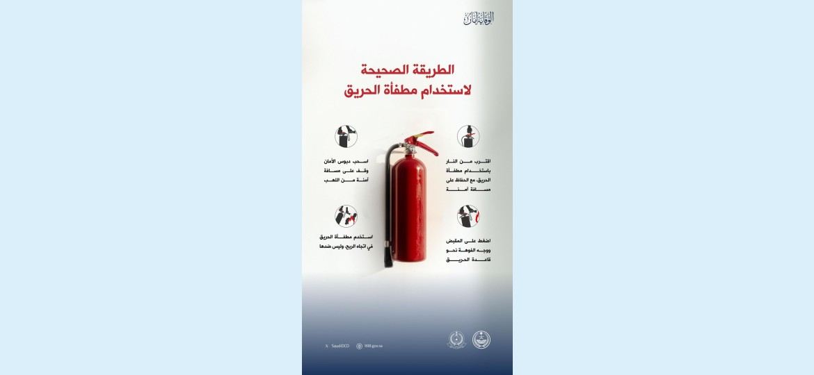 أوضحت المديرية العامة للدفاع المدني أهمية اقتناء طفايات الحريق داخل المنازل، وضرورة تعلم الطرق الصحيحة لاستخدامها عند وقوع حوادث الحريق لا قدر الله؛ حمايةً للإنسان ومحافظةً على الممتلكات.