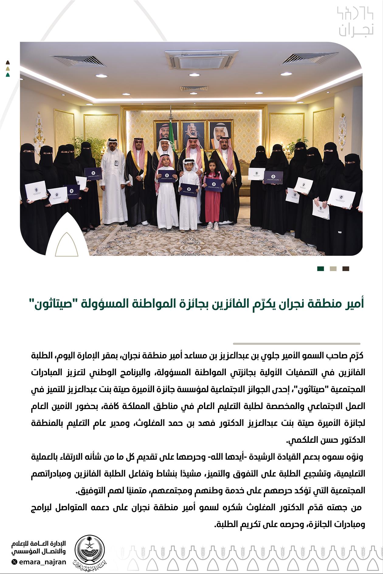 كرّم صاحب السمو الأمير جلوي بن عبدالعزيز بن مساعد أمير منطقة نجران، بمقر الإمارة اليوم، الطلبة الفائزين في التصفيات الأولية بجائزتي المواطنة المسؤولة، والبرنامج الوطني لتعزيز المبادرات المجتمعية "صيتاثون"، إحدى الجوائز الاجتماعية لمؤسسة جائزة الأميرة صيتة بنت عبدالعزيز للتميز في العمل الاجتماعي والمخصصة لطلبة التعليم العام في مناطق المملكة كافة، بحضور الأمين العام لجائزة الأميرة صيتة بنت عبدالعزيز الدكتور فهد بن حمد المغلوث، ومدير عام التعليم بالمنطقة الدكتور حسن العلكمي.