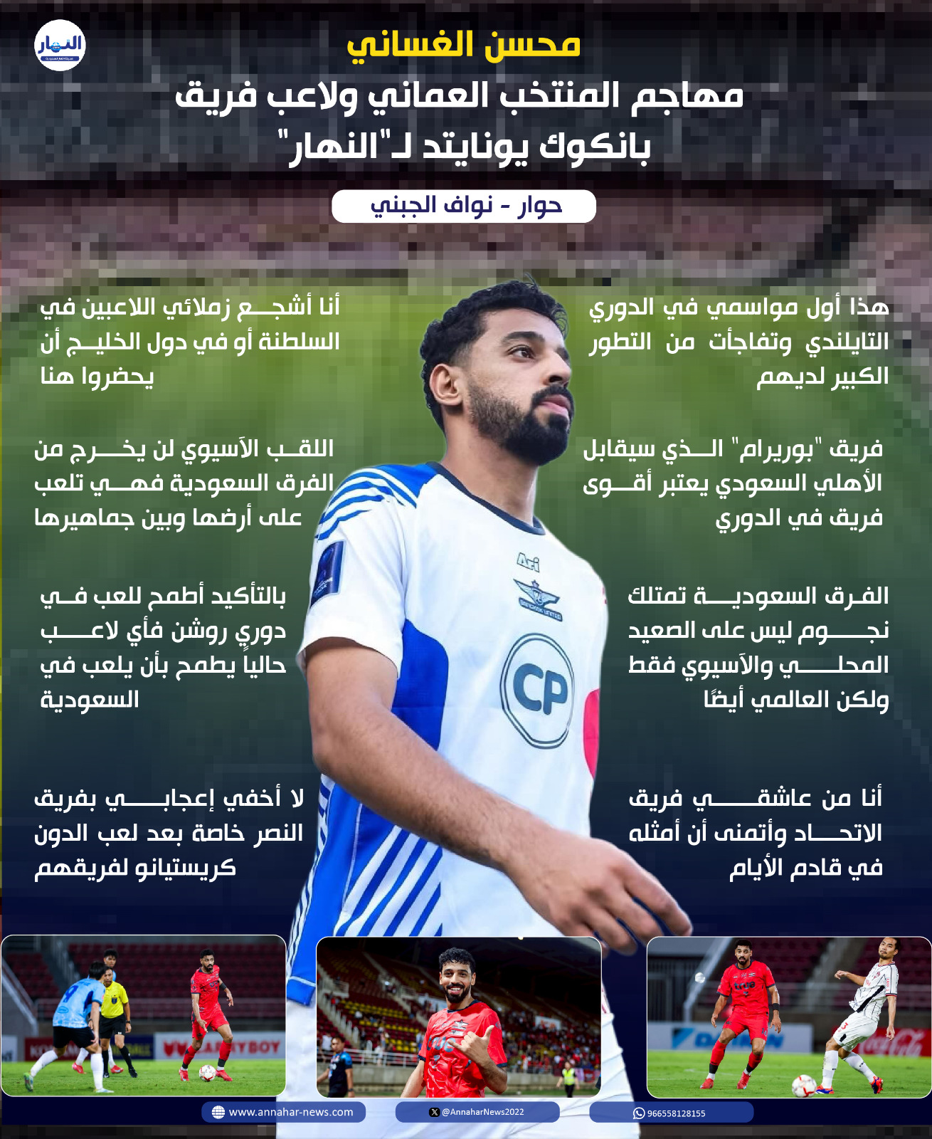 محسن الغساني مهاجم  المنتخب العماني  ولاعب فريق بانكوك يونايتد وثاني هدافي الدوري التايلندي وذلك في أول ثاني تجربة احترافية له خارج سلطنة عمان يتحدث بشكل حصري لصحيفة النهار السعودية عن مباراة الأهلي السعودي وبوريرام التايلندي والتي تلعب ضمن دور الـ 8 من دوري أبطال النخبة الآسيوية.