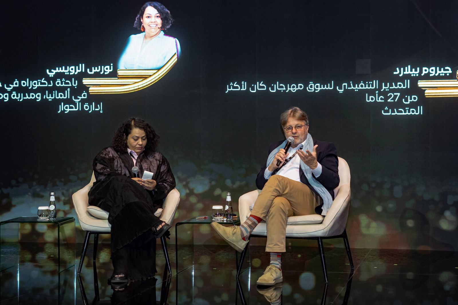 ففي ندوة بعنوان "الفكرة إلى العالمية: كيف يجد صناع الأفلام طريقهم إلى المهرجانات العالمية وأسواقه" قدم المدير التنفيذي السابق لسوق مهرجان (كان) السينمائي جيروم بيلارد جملة من الأفكار والاقتراحات المهنية حول آليات الوصول إلى الجمهور العالمي، مشيرًا إلى أهمية التفكير في التوزيع والفئة المستهدفة منذ المراحل الأولى لإنتاج الفيلم، ومبيناً أن المهرجانات إحدى المنصات والخيارات التي تتيح فرصة الوصول فضلًا عن المنصات الرقمية كبدائل فعالة.