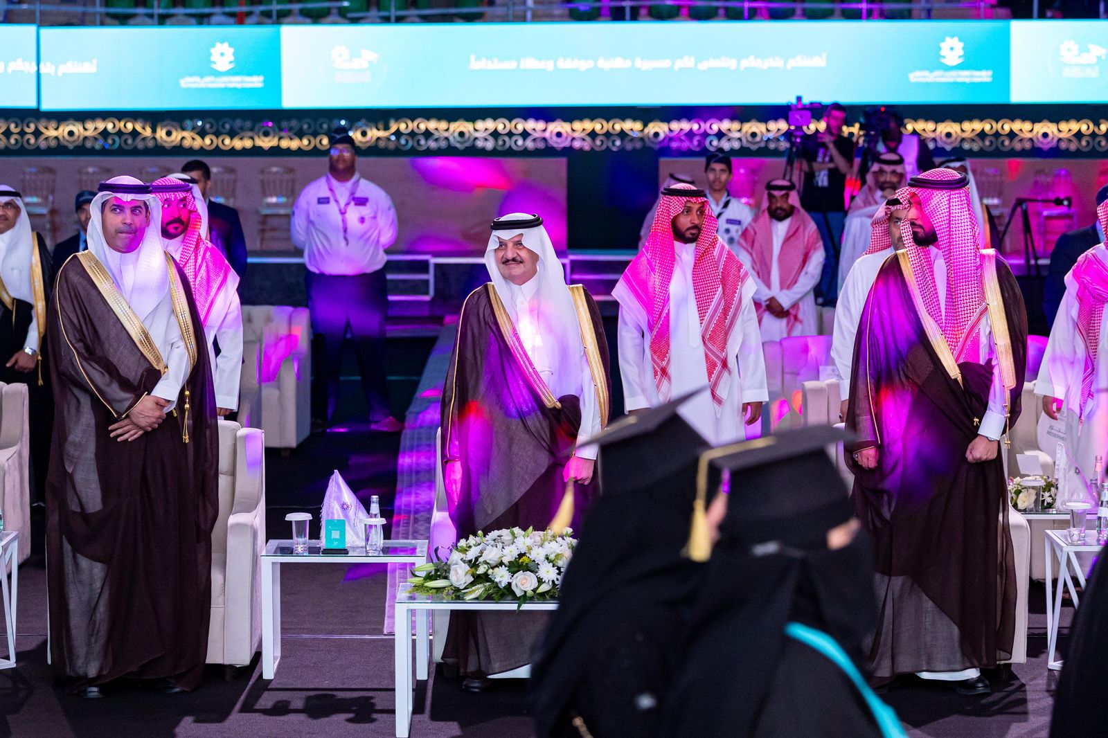 وفي كلمة الخريجين التي ألقاها فهد العمري وريماس السلولي، أكدوا جميعاً أنهم سيمضون قدماً لخدمة الوطن في ظل رؤية طموحة، يشارك فيها الشباب بأيديهم في بناء مستقبل واعد، بعد أن أعطيت الأولوية للمبدعين والموهوبين، ودعمت ثقافة الابتكار، ووفرت فرصاً مميزة للنمو أمام كل خريج وخريجة.