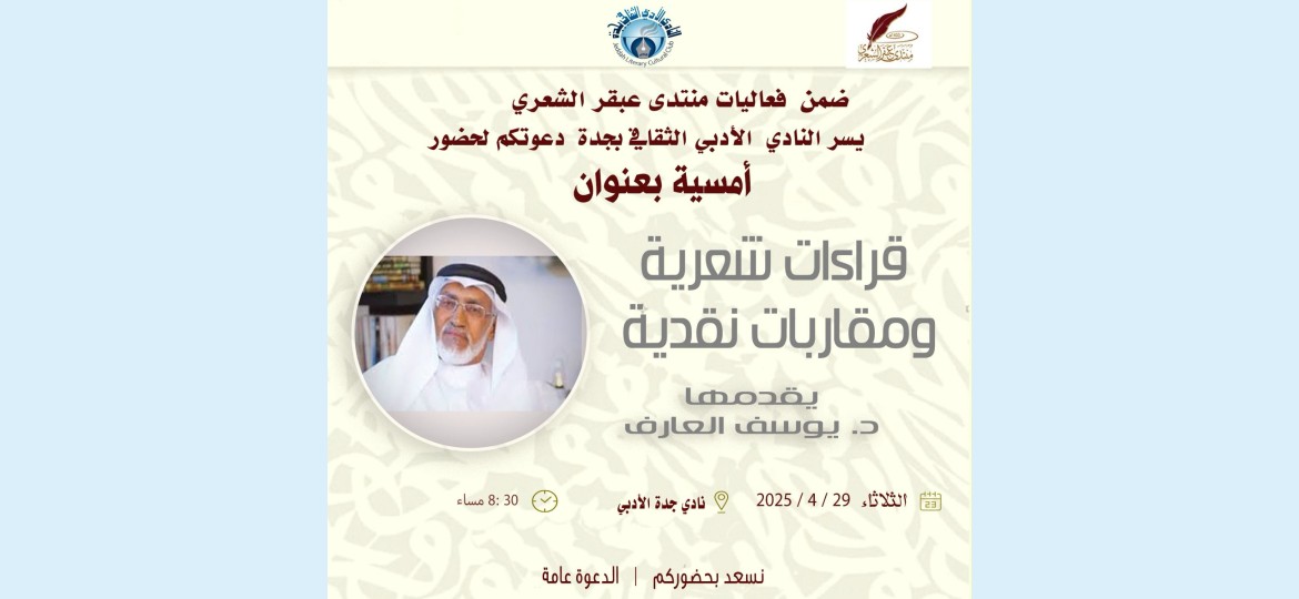 يقيم منتدى عبقر الشعري بالنادي الأدبي بجدة مساء غدا الثلاثاء، 29/4/ 2025 م أمسية يعنوان (قراءات شعريةومقاربات نقدية) يقدمها الدكتور يوسف بن حسن العارف عند الساعة الثامنة والنصف مساء بقاعة مكتبة النادي.