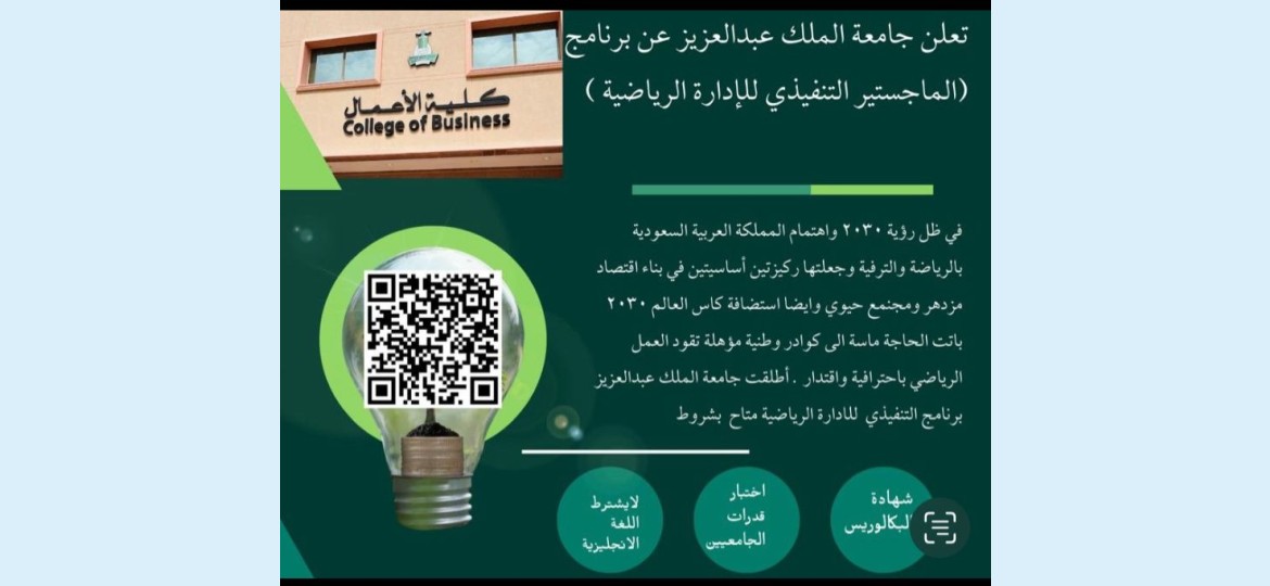 ويُطرح البرنامج في كلية الأعمال بفرع الجامعة في رابغ، ويعد أحد البرامج النوعية التي تجمع بين المعرفة النظرية والتطبيق العملي، حيث يزود الطلبة بمهارات متقدمة في مجالات التخطيط الاستراتيجي، والتسويق والرعاية الرياضية، والإدارة المالية للمؤسسات الرياضية، والقيادة وإدارة التغيير.