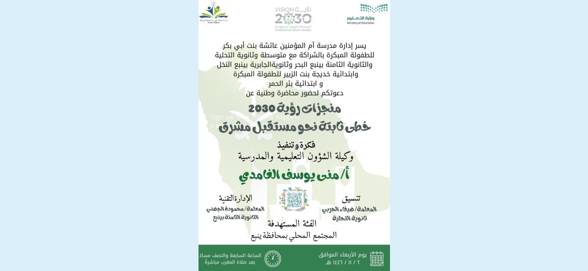 بالتزامن مع إعلان تقرير منجزات رؤية 2030 في ذكرى العام التاسع لانطلاقتها تم تنفيذ أمسية وطنية عن بعد بعنوان (منجزات رؤية 2030 خطى ثابتة نحو مستقبل مشرق) وهي فكرة بادرت بها الوكيلة للشؤون التعليمية والمدرسية المستشار التعليمي والإعلامي وكاتبة الرأي أ. منى يوسف الغامدي وهي منسوبات مدرسة أم المؤمنين عائشة بنت أبي بكر للطفولة المبكرة بينبع الصناعية وبالتنسيق مع متوسطة وثانوية التحلية والتعاون مع المعلمة هيفاء الحربي كما تم الاتفاق مع مديرة الثانوية الثامنة بينبع البحر والتعاون مع المعلمة محمودة الجهني لتكون الإدارة التقنية والقاعة الافتراضية بإدارتها ، ومن ثم تم استهداف مدرسة في قطاع ينبع النخل وهي ثانوية الجابرية بالتنسيق مع المعلمة أماني العمري.