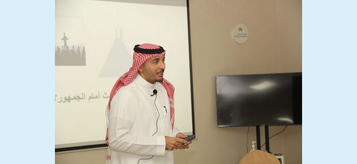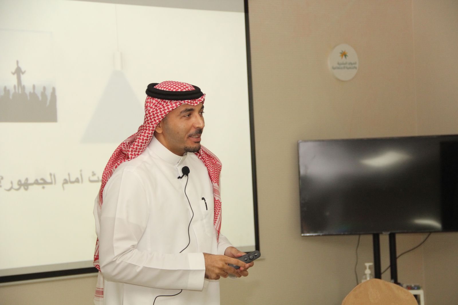 خلال الورشة سلط العمير الضوء على عدة محاور مؤكدًا على أبرز مهارات العرض والإلقاء والمحاذير التي يجب تجنبها.