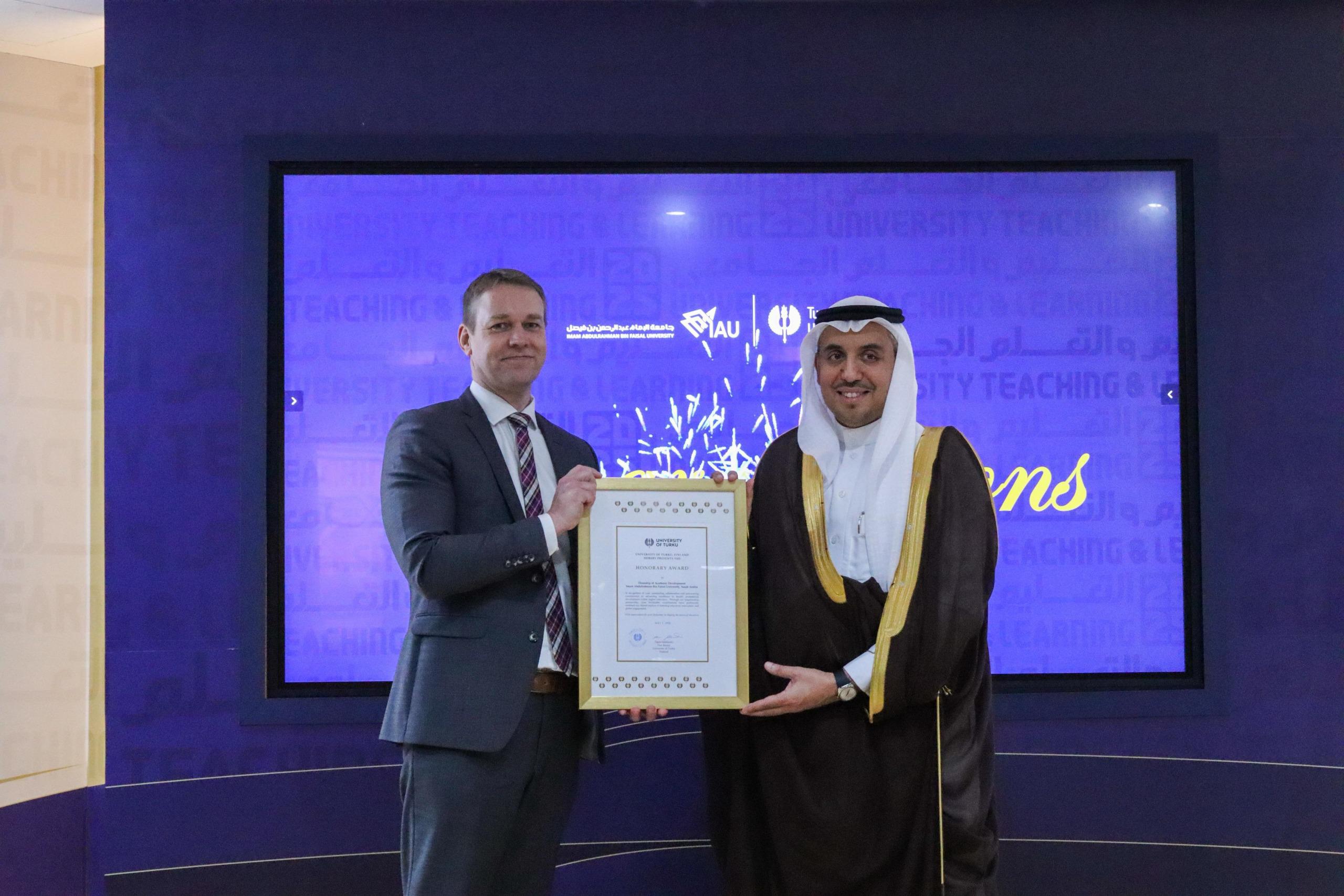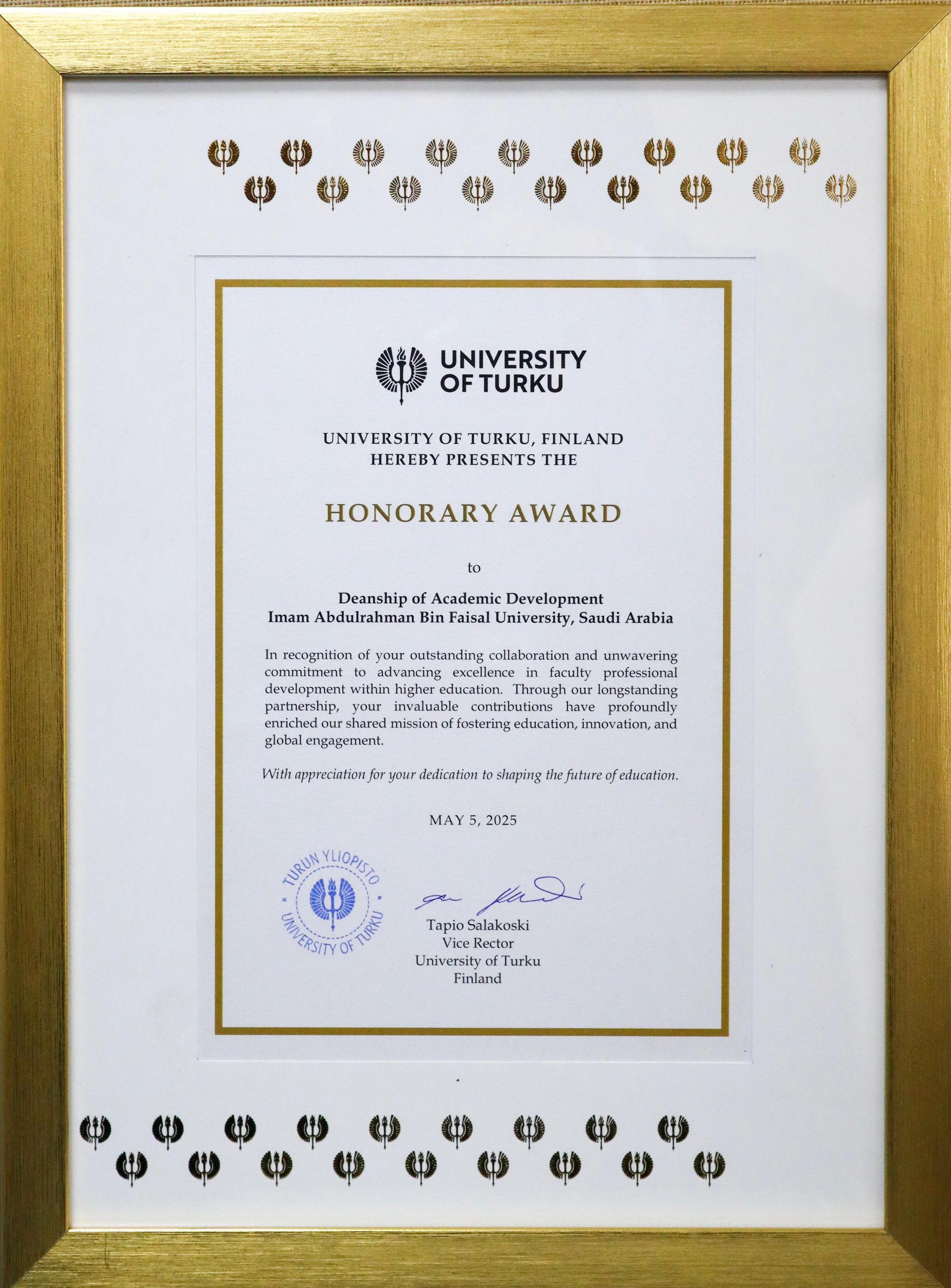 حصلت جامعة الإمام عبد الرحمن بن فيصل، ممثلة في عمادة تطوير التعليم الجامعي، على الجائزة التقديرية من جامعة توركو في فنلندا، وذلك تكريماً لالتزامها الراسخ بتعزيز التميز في التنمية المهنية لأعضاء هيئة التدريس، وتقديراً للشراكة المتينة والمثمرة بين الجامعتين في دعم التعليم والابتكار والتفاعل العالمي.