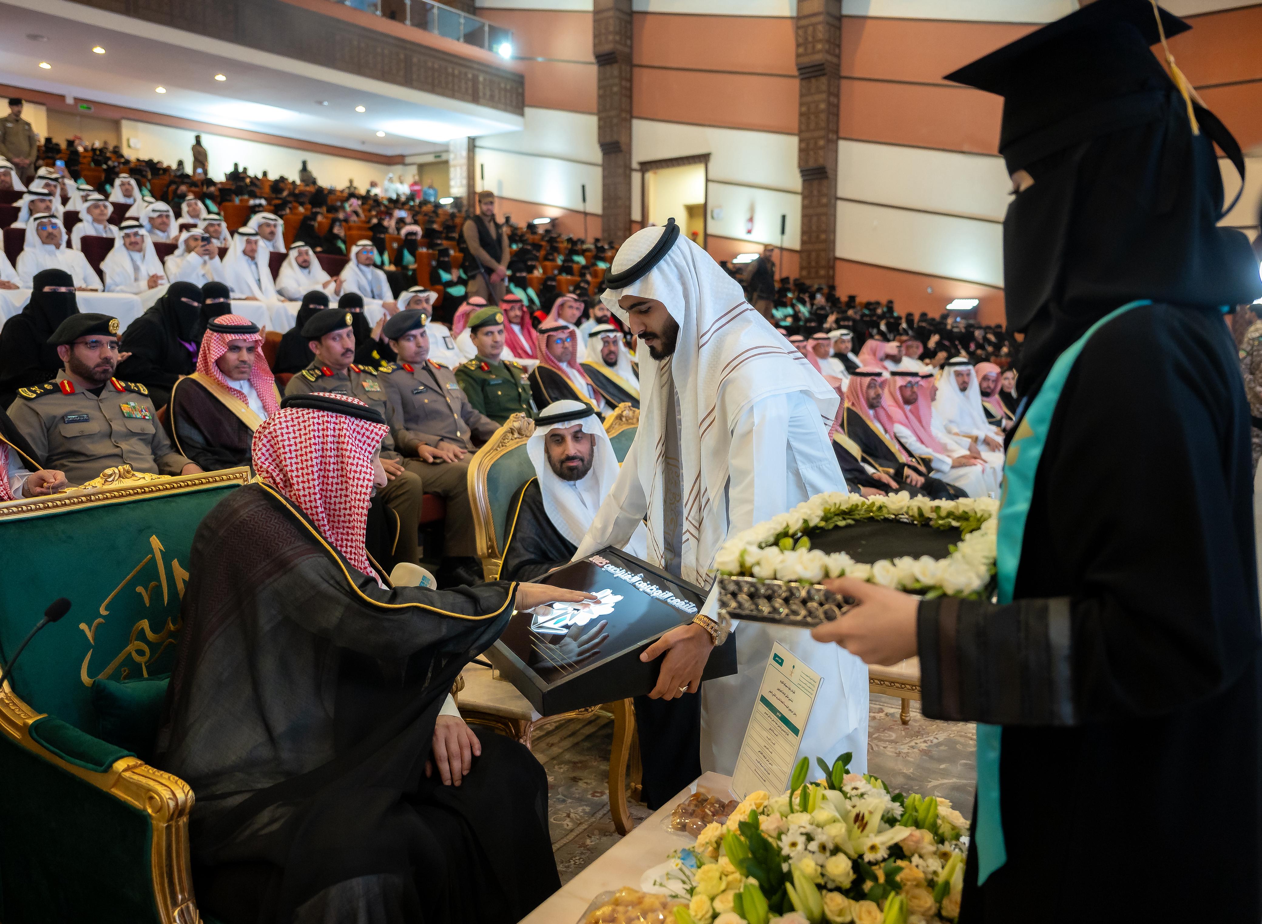 وفور وصول سموّه إلى مقر الحفل، عزف السلام الملكي بعد ذلك بدأ الحفل الخطابي الذي استُهل بتلاوة آيات من القرآن الكريم، ثم ألقت الخريجة شوق بنت سعيد الغامدي كلمة الخريجين، عبّرت فيها عن سعادتهم بالتخرج، مثمنةً رعاية سمو أمير المنطقة وحضوره ومشاركته فرحتهم، ومؤكدةً عزم الخريجين والخريجات على مواصلة العمل لخدمة الدين ثم المليك والوطن.