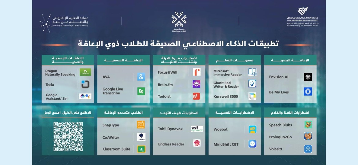 أطلقت جامعة الإمام عبد الرحمن بن فيصل مبادرة رائدة على مستوى المملكة ، تمثلت في إصدار أول دليل سعودي لأدوات وتطبيقات الذكاء الاصطناعي الصديقة للأشخاص ذوي الإعاقة، في خطوة تعكس التزامها العميق بمفاهيم العدالة التعليمية، وتفعيل الأنظمة الوطنية الخاصة بحقوق ذوي الإعاقة في التعليم والتمكين الرقمي.