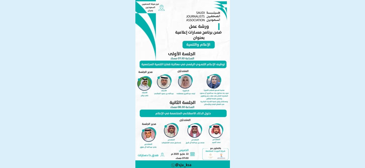 ويشارك في هذه الورشة نخبة من الاعلاميين والمثقفين وأصحاب الرأي وعدد من مراكز واكاديميات التدريب، تتحدث في الجلسة الأولى التي تحمل عنوان( توظيف الإعلام التنموي الرقمي) صاحبة السمو الملكي الأميرة نجود بنت هذلول بن عبد العزيز آل سعود المشرف العام على ملف دعم وتطوير وتمكين الباعة الجائلين ومستشارة وكيل التنمية والقدرات البشرية في القطاع البلدي والإسكان والدكتورة لبنى عبدالعزيز مصطفى، والأستاذ عبد الله الصالحي، ويدير الجلسة الأستاذ علي زينان، وتحمل الجلسة الثانية عنوان(حلول الذكاء الاصطناعي المتخصصة في الإعلام) ويتحدث فيها المهندس محمد بن عبد الله آل شيخ، والمهندس محمد إسماعيل الشنقيطي، والمهندس سعد السيد ويدير الجلسة علي عبد الله آل عتيق.