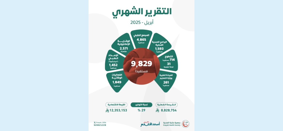 وأوضح الأمين العام للجمعية الدكتور سلمان بن عبد الله المطيري، أن خدمات الجمعية الصحية وصلت إلى 9,829 مستفيدًا خلال شهر أبريل، بقيمة اقتصادية تقدر بـ 12,353,153 ريالًا.