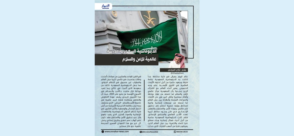 مما جعل الدبلوماسية السعودية تكثف من جهودها التي أثمرت في نتائج ربما تعيد صياغة فكر متجدد بالأمن والسلام في الأسبوع الأوسط من مايو عام ٢٠٢٥، حيث أن هذا الأسبوع تاريخي يشهد عودة التفاوض والتفاهم ومعالجة قضايا كبرى عالمية في عاصمة الأمن والسلام - الرياض - التي ستشهد زيارة ترمب والقمة الخليجية الأمريكية من أجل انتصار الإعتدال والوسطية والأمن الفكري، في فترة تنتظر الحلول الدبلوماسية والتفاهمات الإنسانية والصوت المتزن، الذي يعيد نضوج فكر نحو تحقيق الأمن والاستقرار فقد نكون على أبواب عصر ذهبي وتاريخ إنساني يحمل كل خير مع هذا النموذج العصري كمدرسة عالمية نحو فكر مستنير.