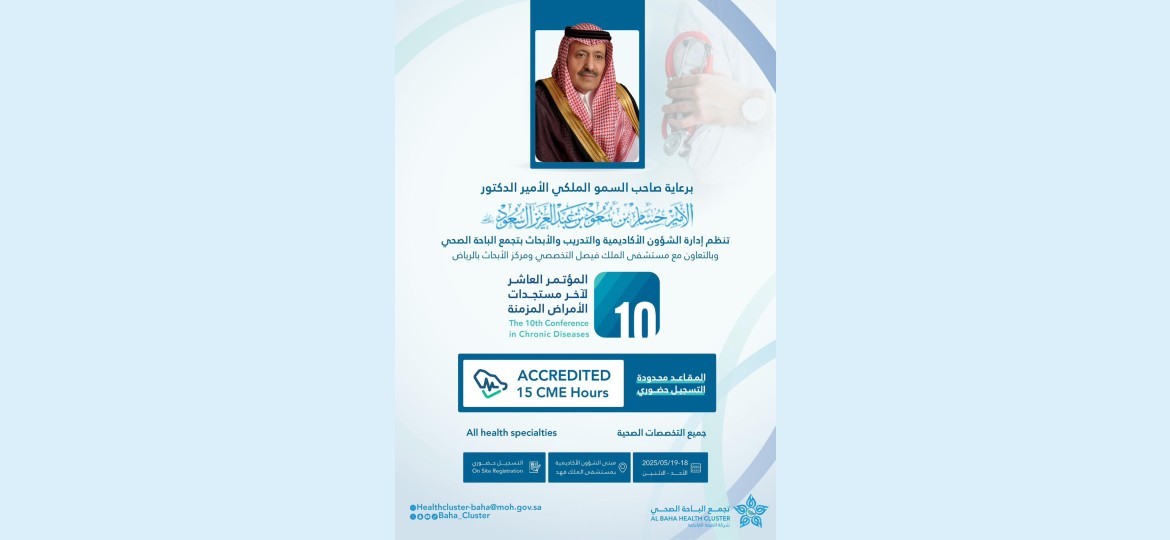 تنطلق يوم الأحد القادم، الموافق 18 مايو 2025م، فعاليات “المؤتمر العاشر لآخر مستجدات الأمراض المزمنة”، والذي يستمر على مدى يومين (الأحد والاثنين 18–19 مايو 2025م)، وذلك برعاية كريمة من صاحب السمو الملكي الأمير الدكتور حسام بن سعود بن عبدالعزيز آل سعود، أمير منطقة الباحة – حفظه الله –، وتنظيم تجمع الباحة الصحي، وبالتعاون مع مركز الملك فيصل التخصصي ومركز الأبحاث بالرياض.
