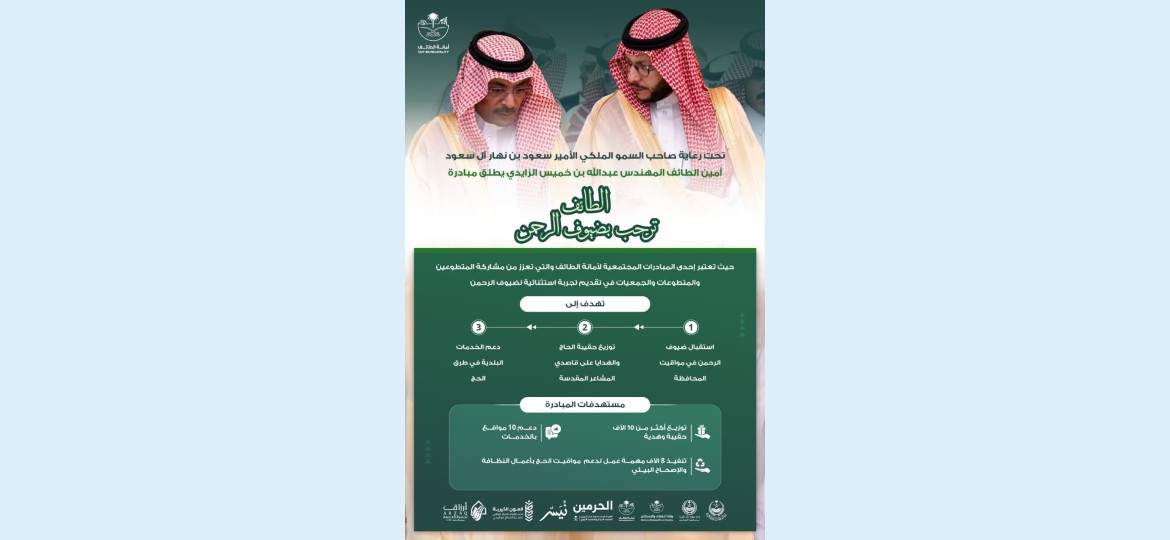 أطلق أمين الطائف المهندس عبدالله الزايدي مبادرة "الطائف ترحب بضيوف الرحمن" التطوعية، وذلك بمشاركة الجهات الحكومية والقطاع الغير ربحي ضمن جهود التسهيل على ضيوف الرحمن لموسم حج 1446 في مطار الطائف الدولي وميقاتي الحج "قرن المنازل" بالسيل الكبير و"وادي محرم" بالهدا ، ومركز الفرز الأمني بالبهيتة.
