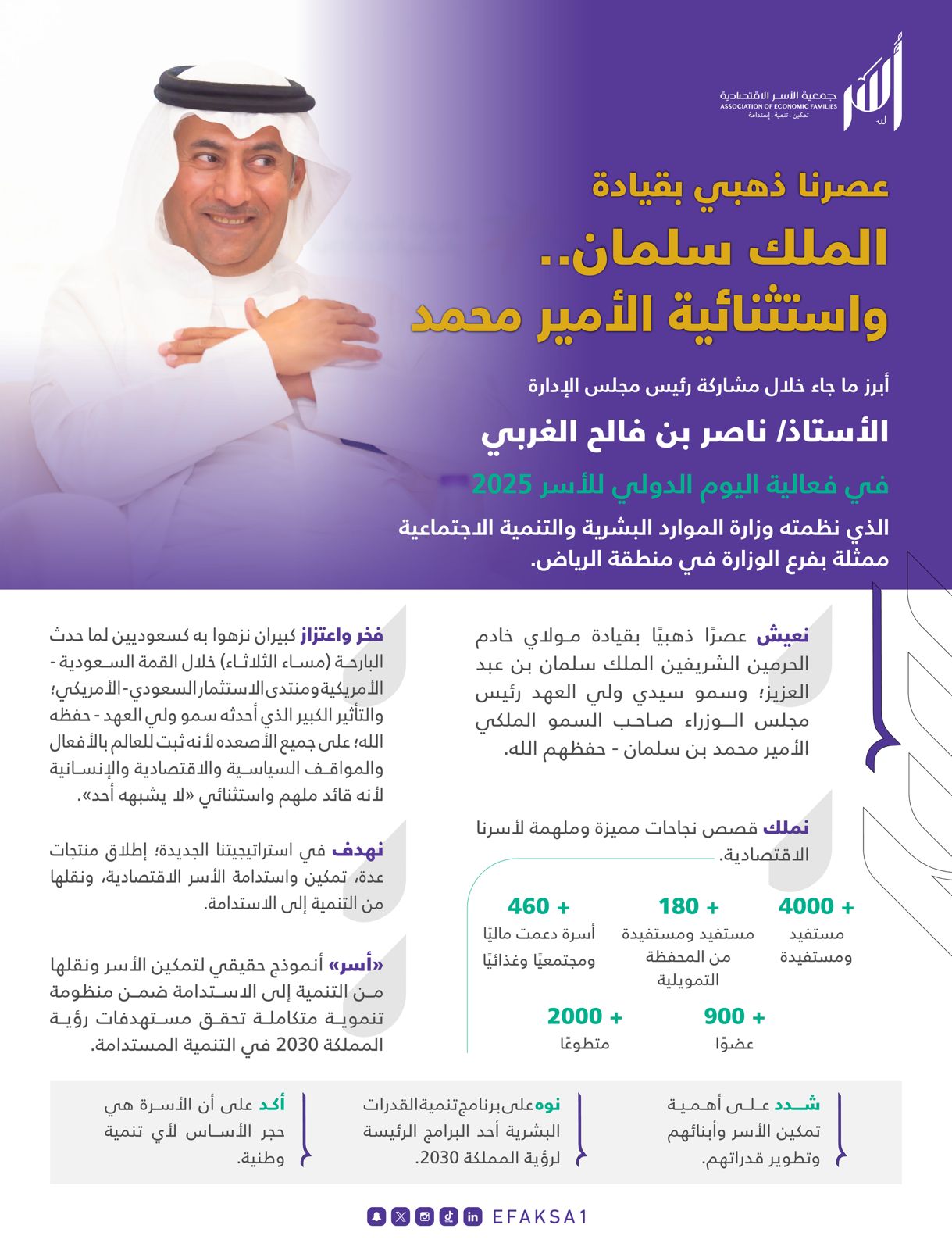 يذكر أن اليوم الدولي للأسر2025، يأتي في إطار تعزيز دور الأسرة في المجتمع وتحقيق الأهداف التنموية المستدامة، بما يحقق محاور رؤية السعودية 2030 "مجتمع حيوي.. اقتصاد مزدهر.. وطن طموح".