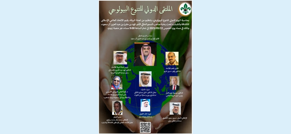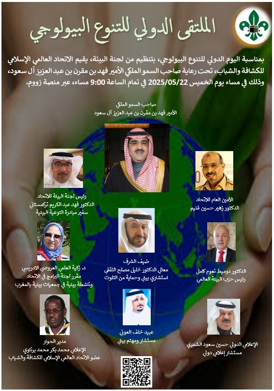 تحت رعاية صاحب السمو الملكي الأمير فهد بن مقرن بن عبدالعزيز آل سعود يفعل الاتحاد العالمي الإسلامي للكشافة والشباب اليوم العالمي للتنوع البيولوجي وذلك بتنظيم الملتقى الدولي للتنوع البيولوجي ممثلاً بلجنة البيئة وبإشراف الأمين العام للاتحاد سعادة الدكتور زهير بن حسين غنيم وضيف الشرف معالي الدكتور خليل الثقفي ونخبة من المتميزين في المجال البيئي.