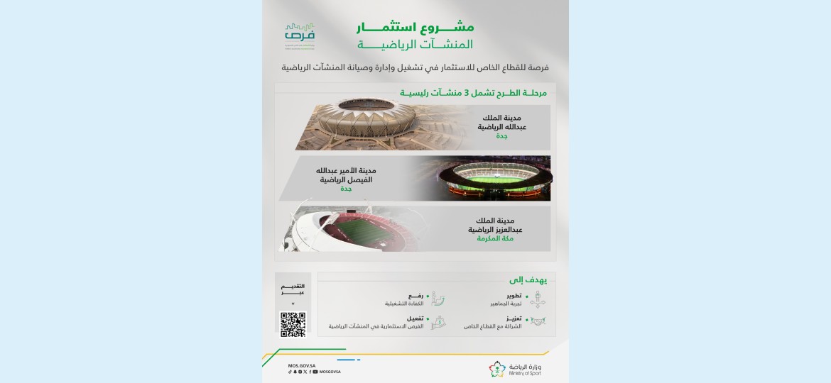 ويتيح المشروع العديد من الفرص الاستثمارية للقطاع الخاص بعقود تمتد لخمس سنوات قابلة للتمديد، ومن هذه الفرص: امتلاك حقوق التسمية، وتأجير الملاعب للأندية الرياضية وللجهات الأخرى في غير أيام المباريات، بالإضافة إلى تشغيل وإدارة المنشآت الرياضية وصيانتها، وغيرها من أوجه الاستثمار داخل هذه المنشآت وذلك وفق نماذج تشغيلية حديثة تُسهم في رفع كفاءة المنشآت، وتحسين جودة الخدمات المقدمة، وتوسيع آفاق الاستثمار التجاري، والارتقاء بتجربة الجماهير داخل المنشآت الرياضية.