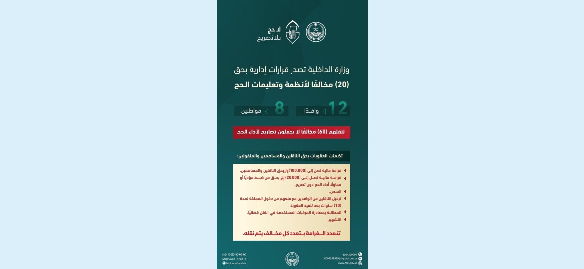 وأصدرت الوزارة بحق الناقلين والمساهمين والمنقولين قرارات إدارية عبر اللجان الإدارية الموسمية، تضمنت عقوبات بالسجن وغرامات مالية تصل إلى (100,000) ريال، والتشهير بالناقلين وترحيل الوافدين منهم مع منعهم من دخول المملكة لمدة (10) سنوات بعد تنفيذ العقوبة، والمطالبة بمصادرة المركبات المستخدمة في النقل قضائيًا، ومعاقبة من حاول أداء الحج دون تصريح بغرامة مالية تصل إلى (20,000) ريال.
