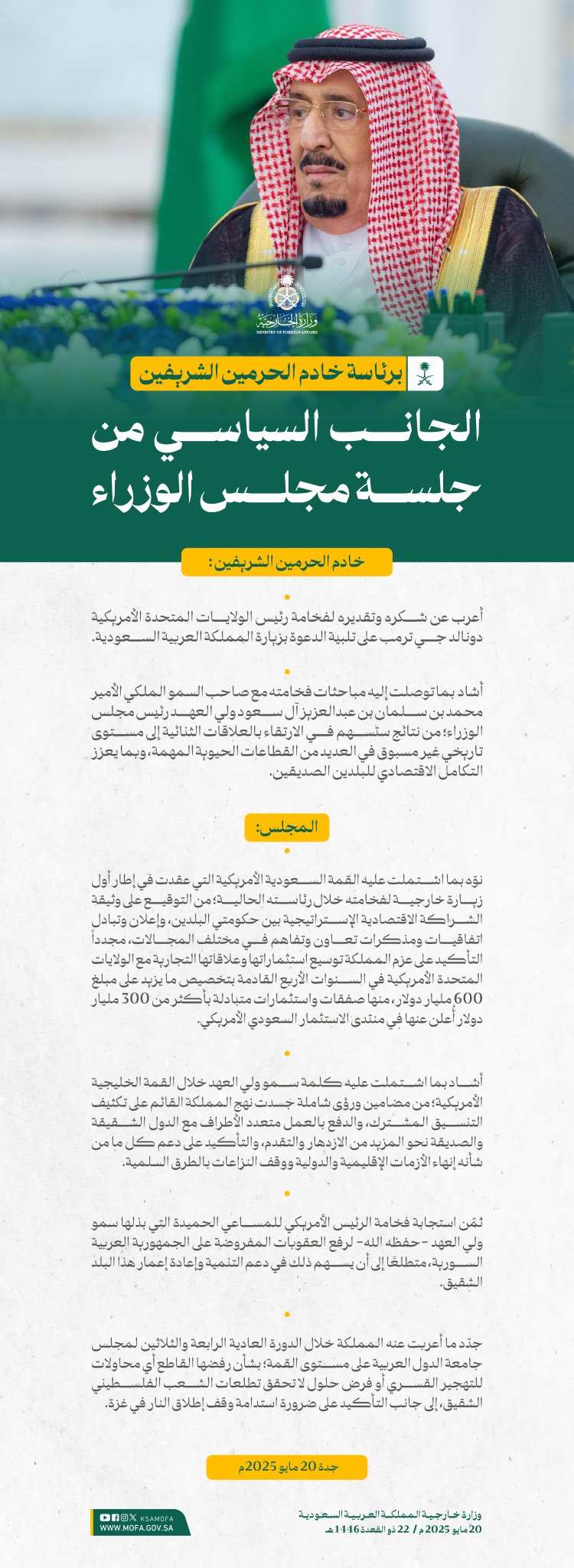 كما نوه مجلس الوزراء بما اشتملت عليها القمة السعودية - الأمريكية التي عقدت في إطار أول زيارة خارجية خلال رئاسته الحالية، من التوقيع على وثيقة الشراكة الاقتصادية الإستراتيجية بين حكومتي البلدين، وإعلان وتبادل اتفاقيات ومذكرات تعاون وتفاهم في مختلف المجالات، مجددا التأكيد على عزم المملكة توسيع استثماراتها وعلاقاتها التجارية مع الولايات المتحدة الأمريكية في السنوات الأربع القادمة بتخصيص ما يزيد على مبلغ 600 مليار دولار، منها صفقات واستثمارات متبادلة بأكثر من 300 مليار دولار، أُعلن عنها في منتدى الاستثمار السعودي - الأمريكي.