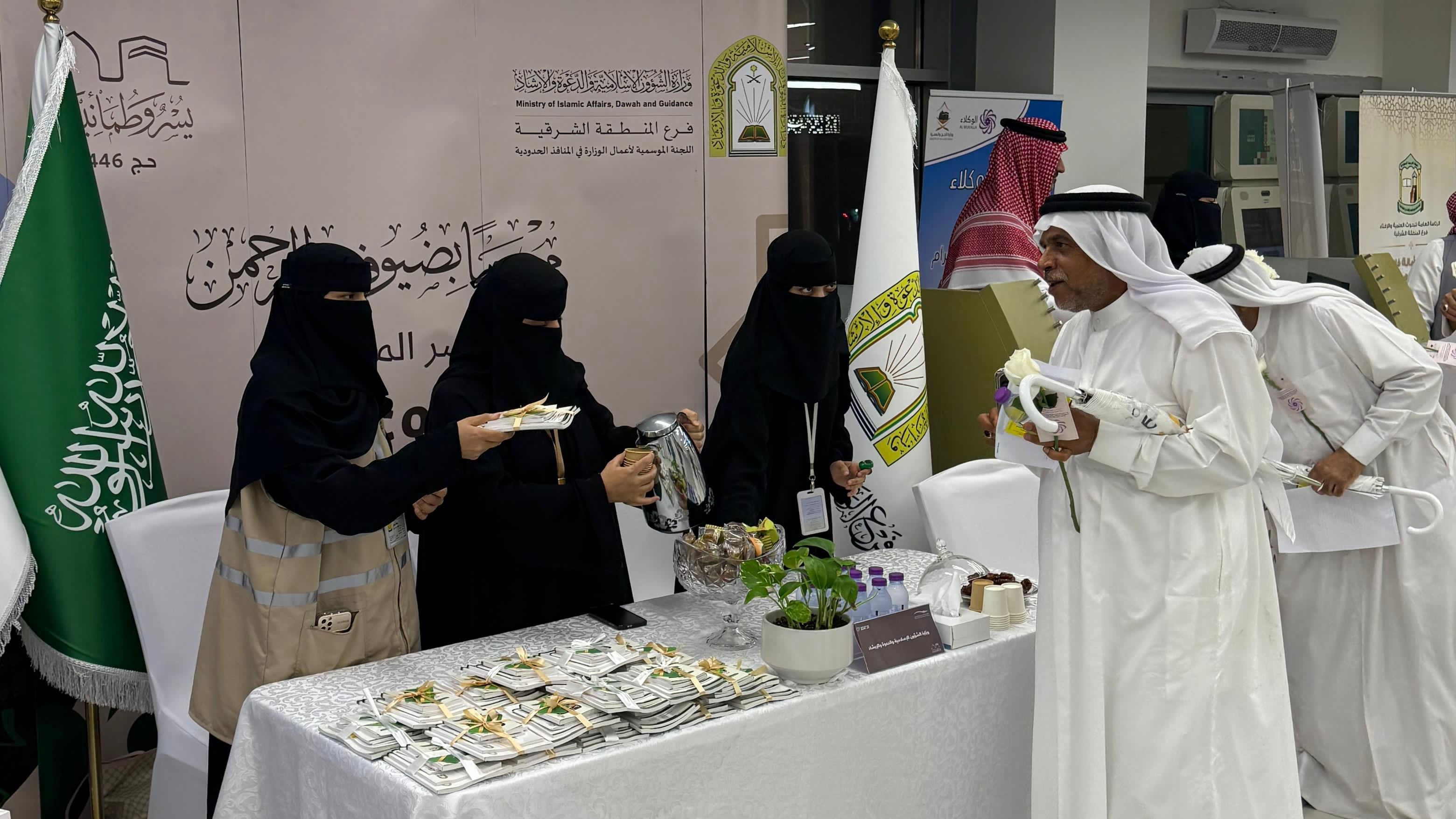 وقدّم منسوبو ومنسوبات الوزارة المشاركون في الاستقبال القهوة السعودية والتمور ومجموعة مختارة من الحلويات، في مشهد يجسّد الكرم السعودي الأصيل ويُعبّر عن التقدير الكبير لضيوف الرحمن منذ لحظة وصولهم.