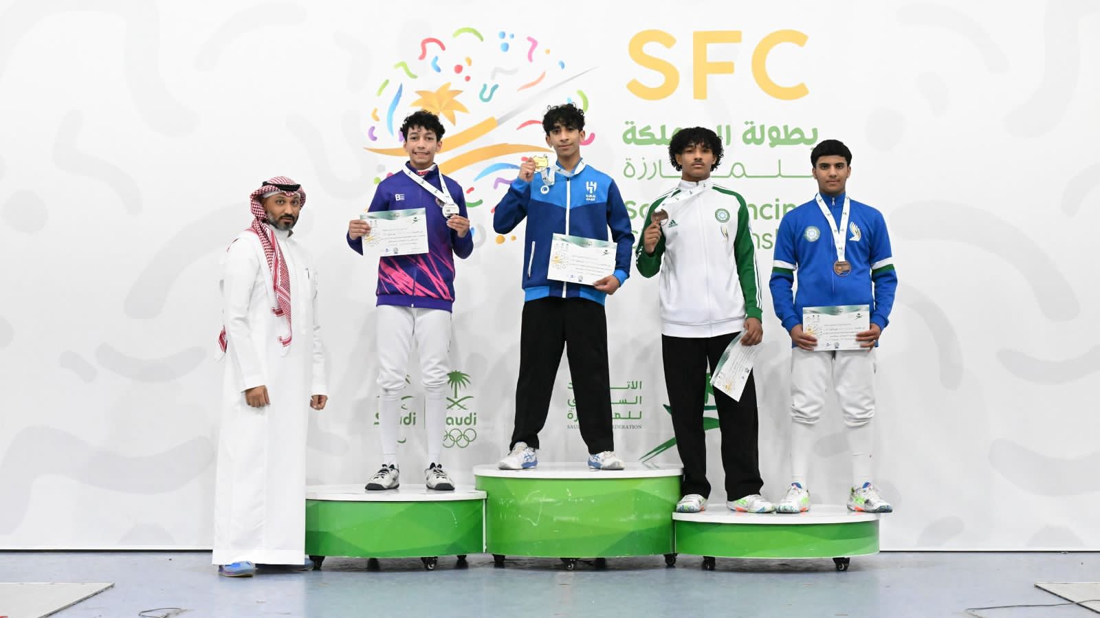 وانتزع فياض العبيد (الاتحاد) ذهبية سلاح السيبر، وظفر علي العماني (الهدى) بالفضية، وأحرز زميله محمد الداوود، الميدالية البرونزية، وعبدالله العبيد (الاتحاد) المركز الثالث مكرر.