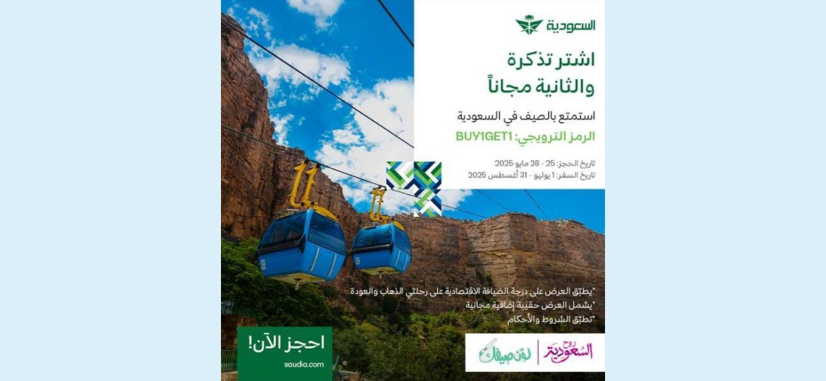 وما يجعل عرض (الخطوط الجوية السعودية) من أبرز عروض (صيف السعودية 2025)؛ أنه يتيح شراء تذكرة طيران والحصول على التذكرة الثانية مجانًا للاستمتاع بالصيف في السعودية من خلال رمز ترويجي، على أن يكون تاريخ الحجز من 25 إلى 28 مايو الجاري، ويكون تاريخ السفر خلال الفترة من 1 يوليو إلى 31 أغسطس.