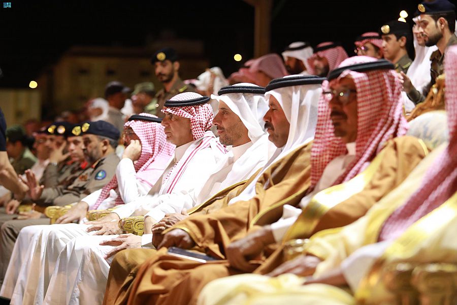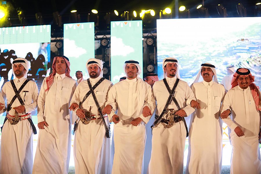 واختتم الحفل بأوبريت بعنوان " توأم الغيم " احتوى على عدة لوحات شعبية تمثل فنون العرضة واللعب والخطوة وتحكي قصة وطن يعيش الجميع تحت رايته .