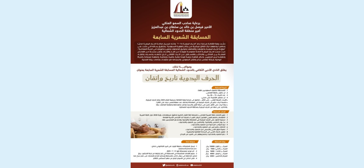 برعاية كريمة من صاحب السمو الملكي الأمير فيصل بن خالد بن سلطان بن عبد العزيز، أمير منطقة الحدود الشمالية، يطلق النادي الأدبي الثقافي بالمنطقة المسابقة الشعرية السابعة تحت عنوان "الحرف اليدوية.. تاريخ وإتقان".