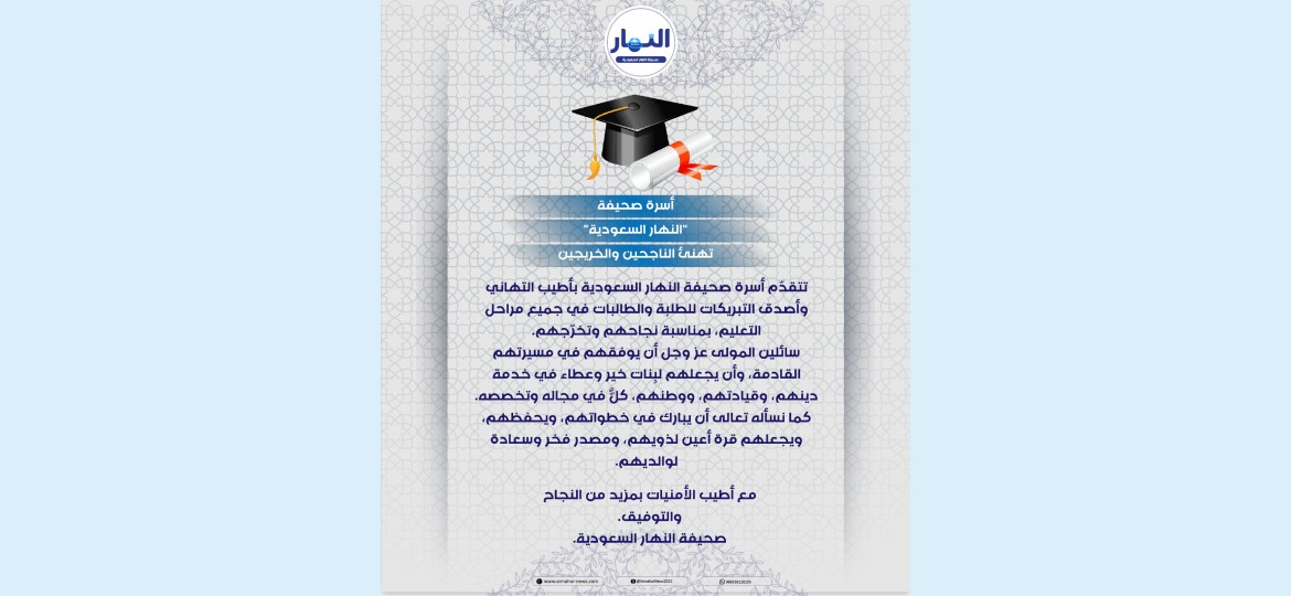 تتقدّم أسرة صحيفة النهار السعودية بأطيب التهاني وأصدق التبريكات لأبنائها من الطلبة والطالبات في جميع مراحل التعليم، بمناسبة نجاحهم وتخرّجهم.